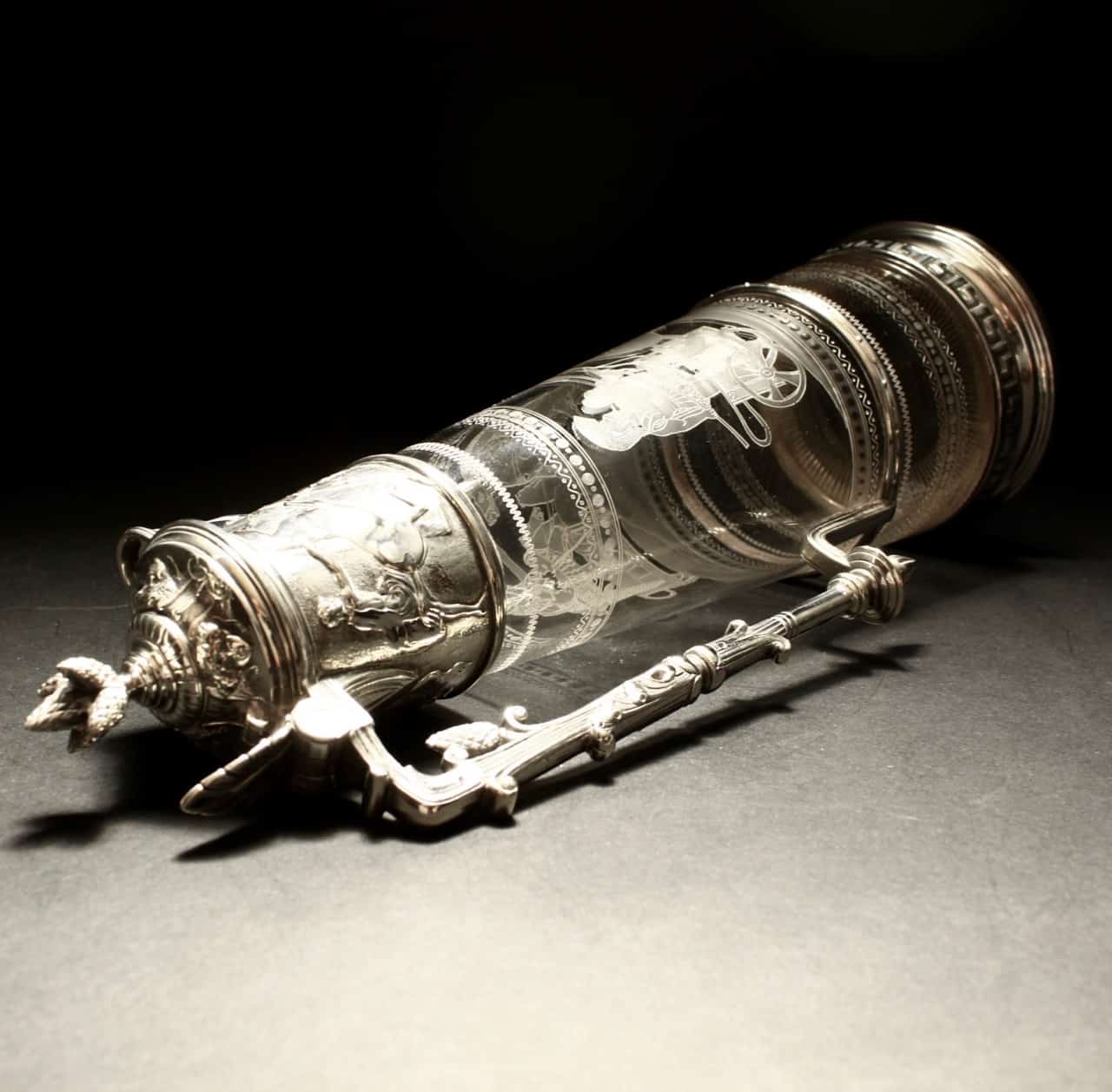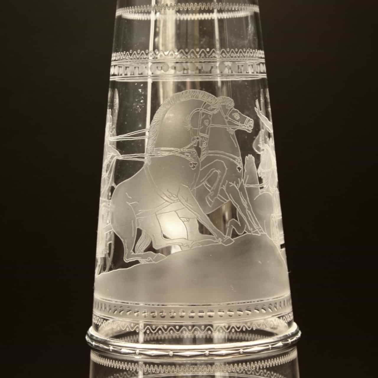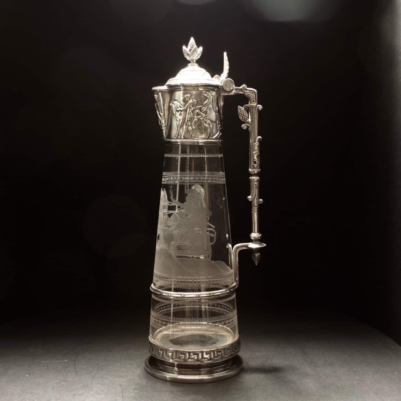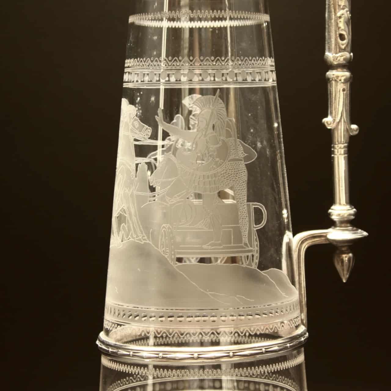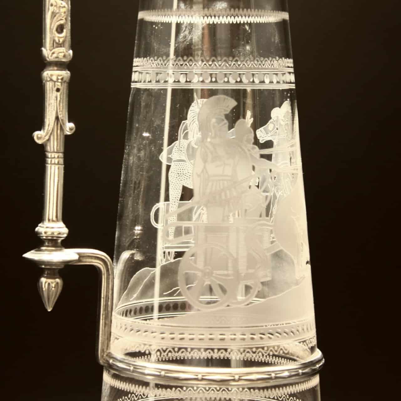 The Victorian Richardson glass claret jug dates to 19th century and the quality of the acid etched Roman soldier and chariot is superb. The claret jug comprises of a acorn finial lid that is date stamped with makers mark for Elkington with the stamped number 12362 with cherub faces around the top of the hinged lid with the most magnificent handle. The body is a work of art with two roman chariots with Roman soldiers and horses with lower acid etched border, resting in a Greek key silver plated base with the bottom base of the glass having been polished with outer blazes cut in. Truly magnificent.