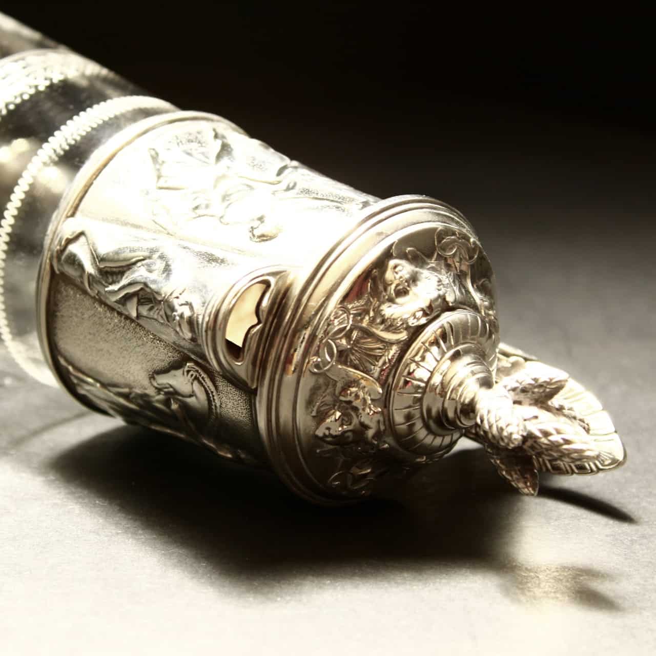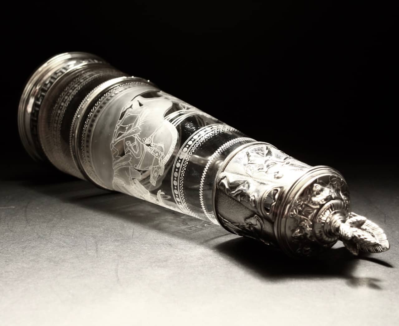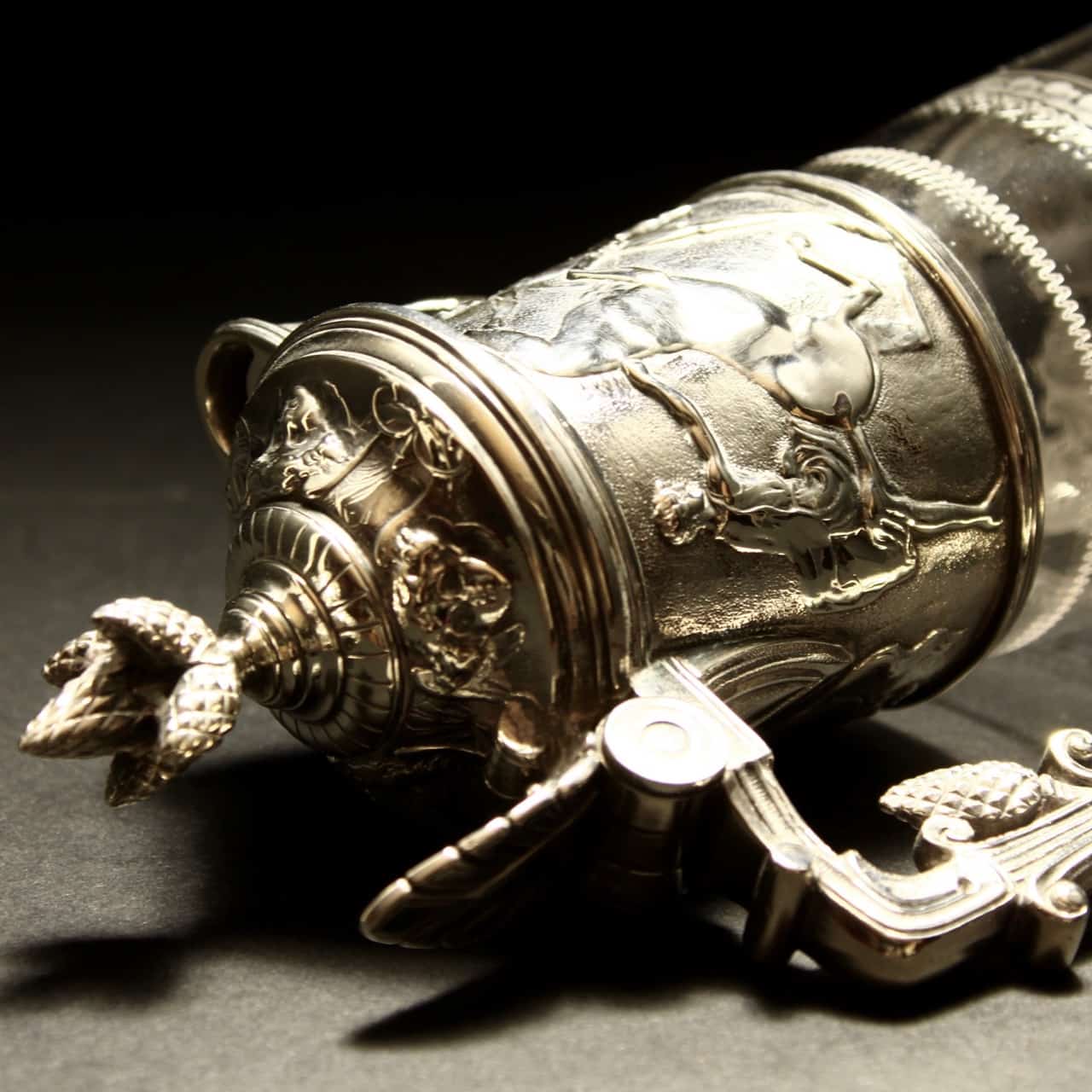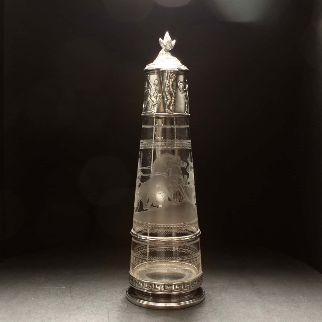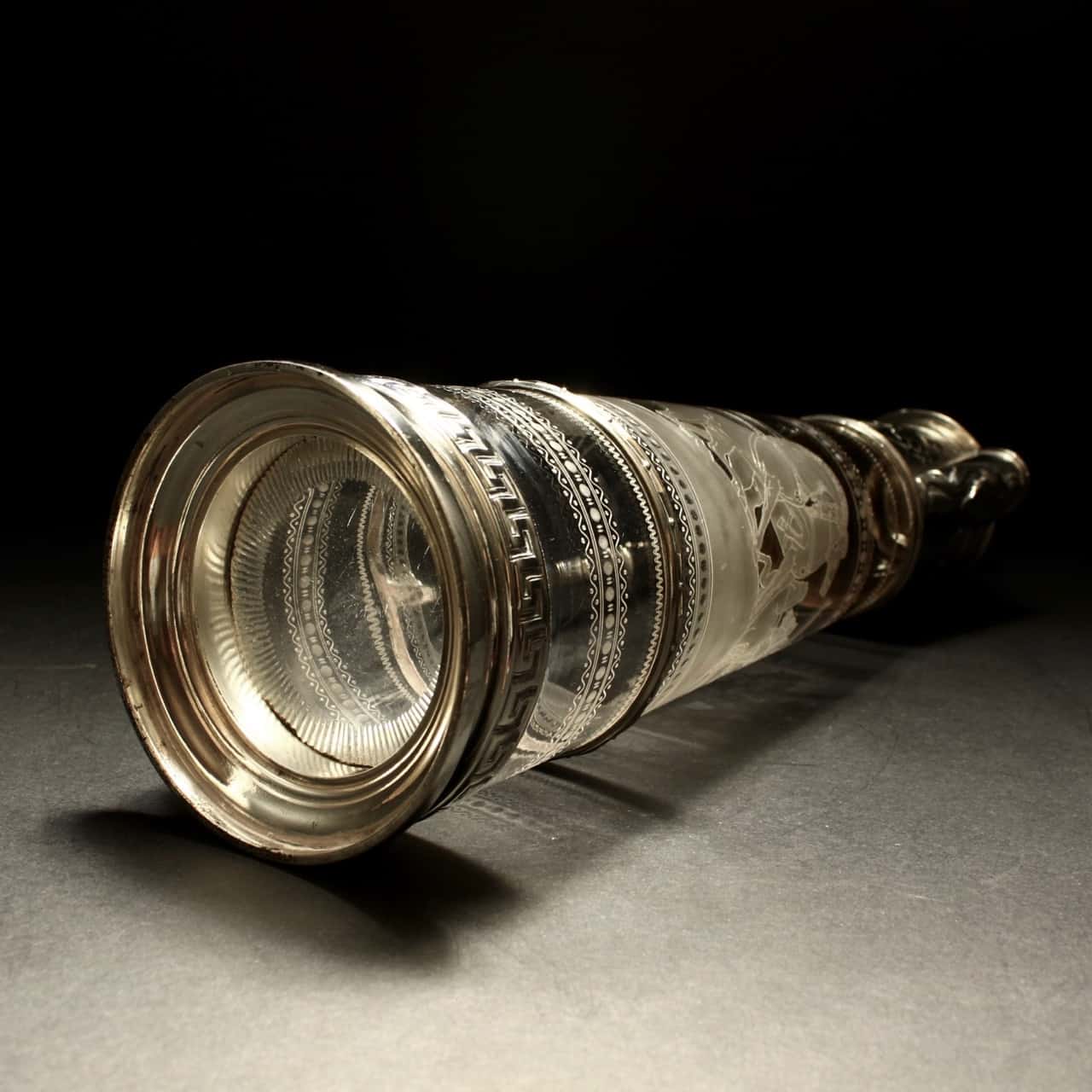 The Victorian Richardson glass claret jug dates to 19th century and the quality of the acid etched Roman soldier and chariot is superb. The claret jug comprises of a acorn finial lid that is date stamped with makers mark for Elkington with the stamped number 12362 with cherub faces around the top of the hinged lid with the most magnificent handle. The body is a work of art with two roman chariots with Roman soldiers and horses with lower acid etched border, resting in a Greek key silver plated base with the bottom base of the glass having been polished with outer blazes cut in. Truly magnificent.