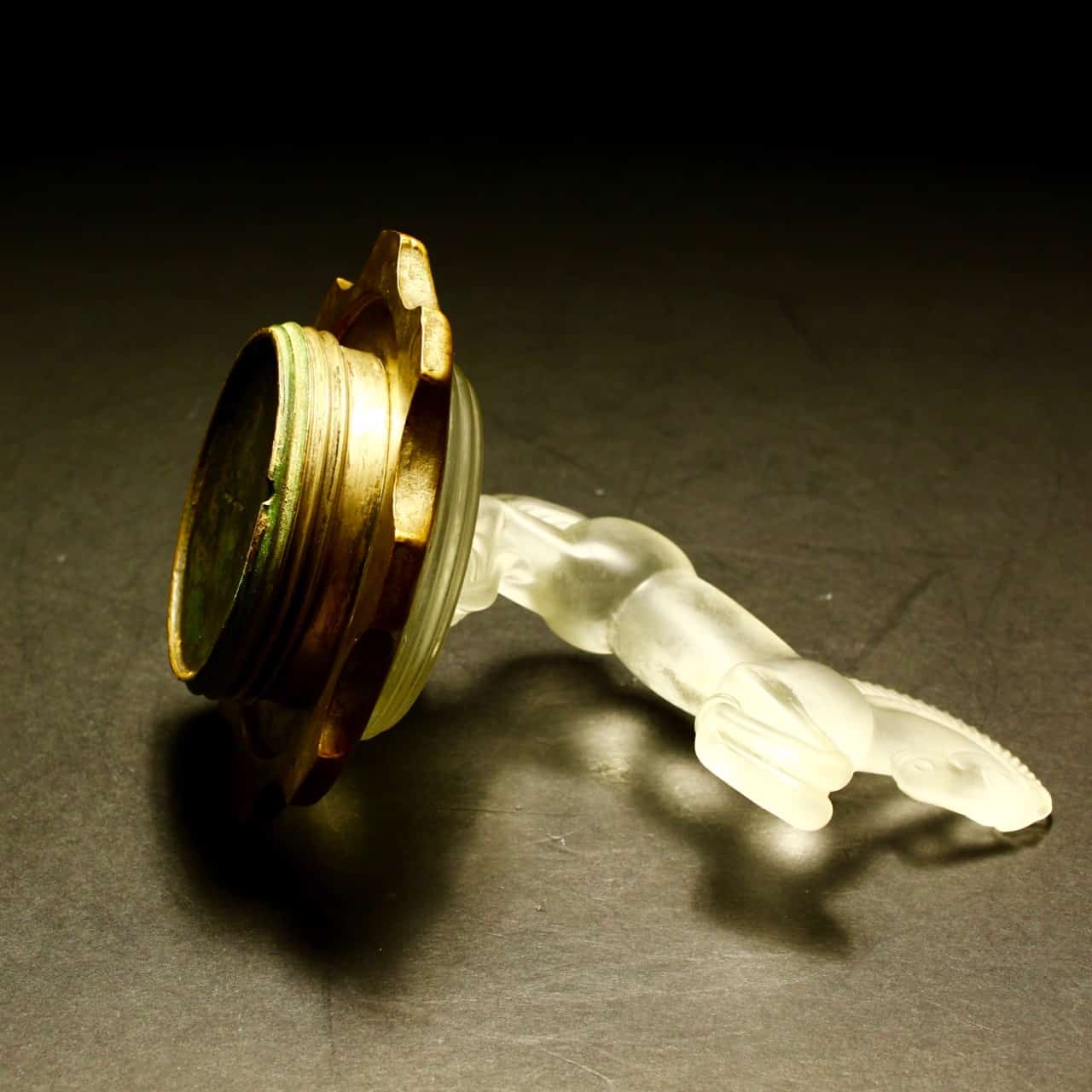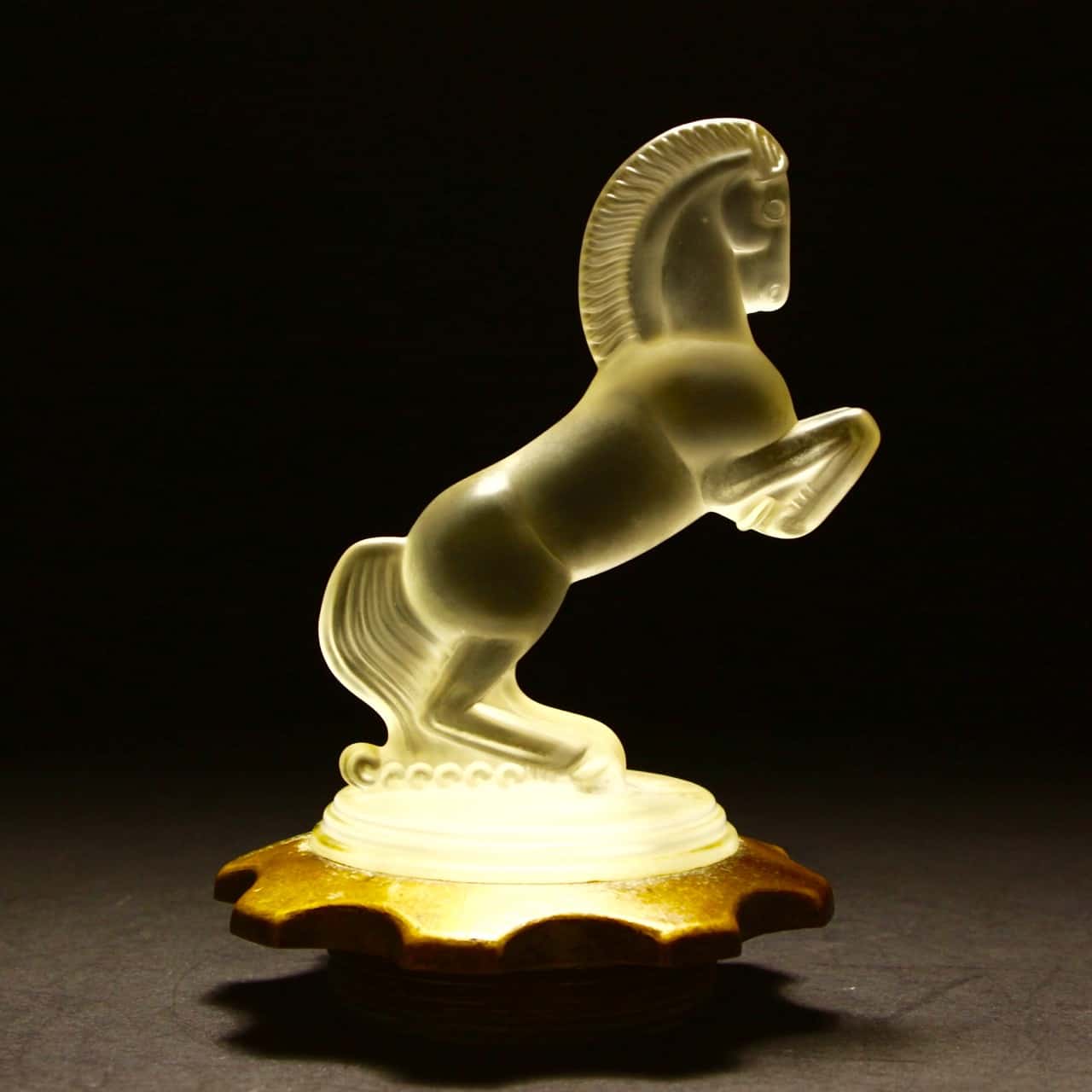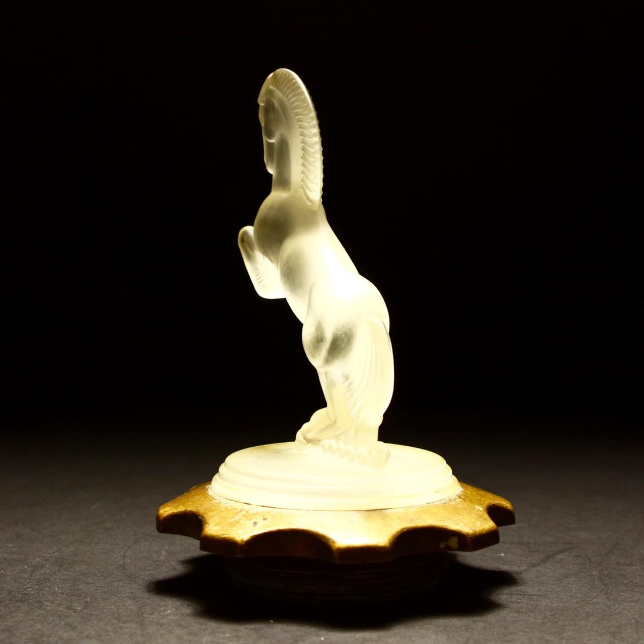 The Ferrari frosted glass car mascot comprises of a rearing horse set into a car radiator base and would date to the 1950s. The car mascot could have been designed by H.G Ascher and could have been retailed under Red Ashay. The base of the radiator cap is marked Patent. The car mascot is modelled on the Ferrari Horse and is quite unusual.
