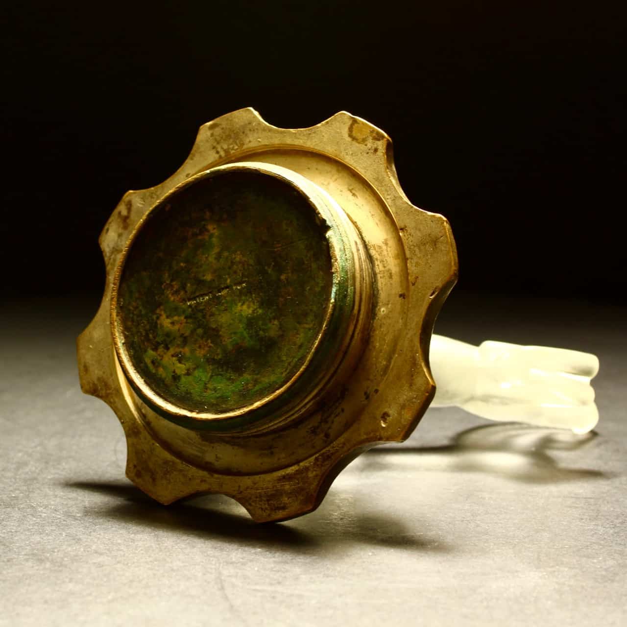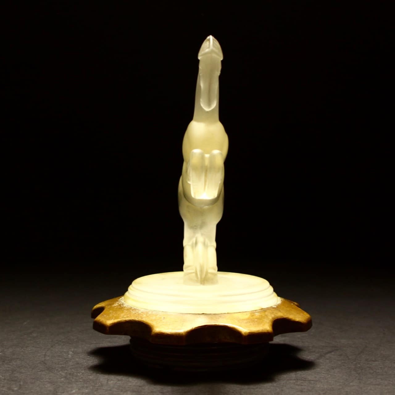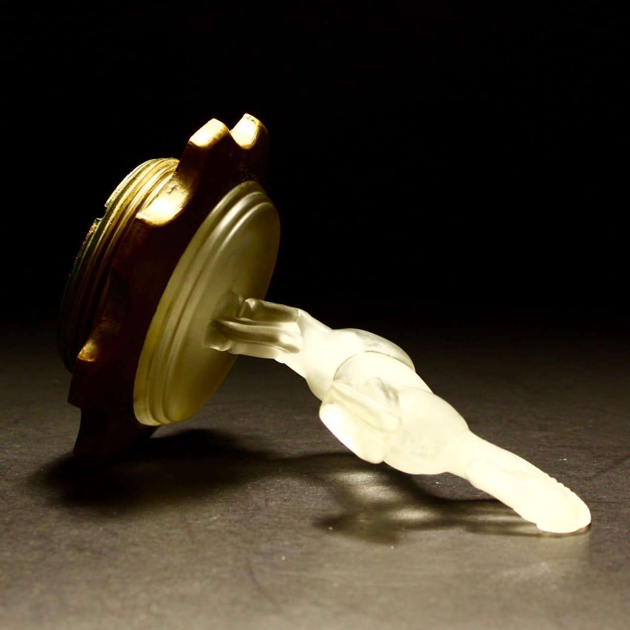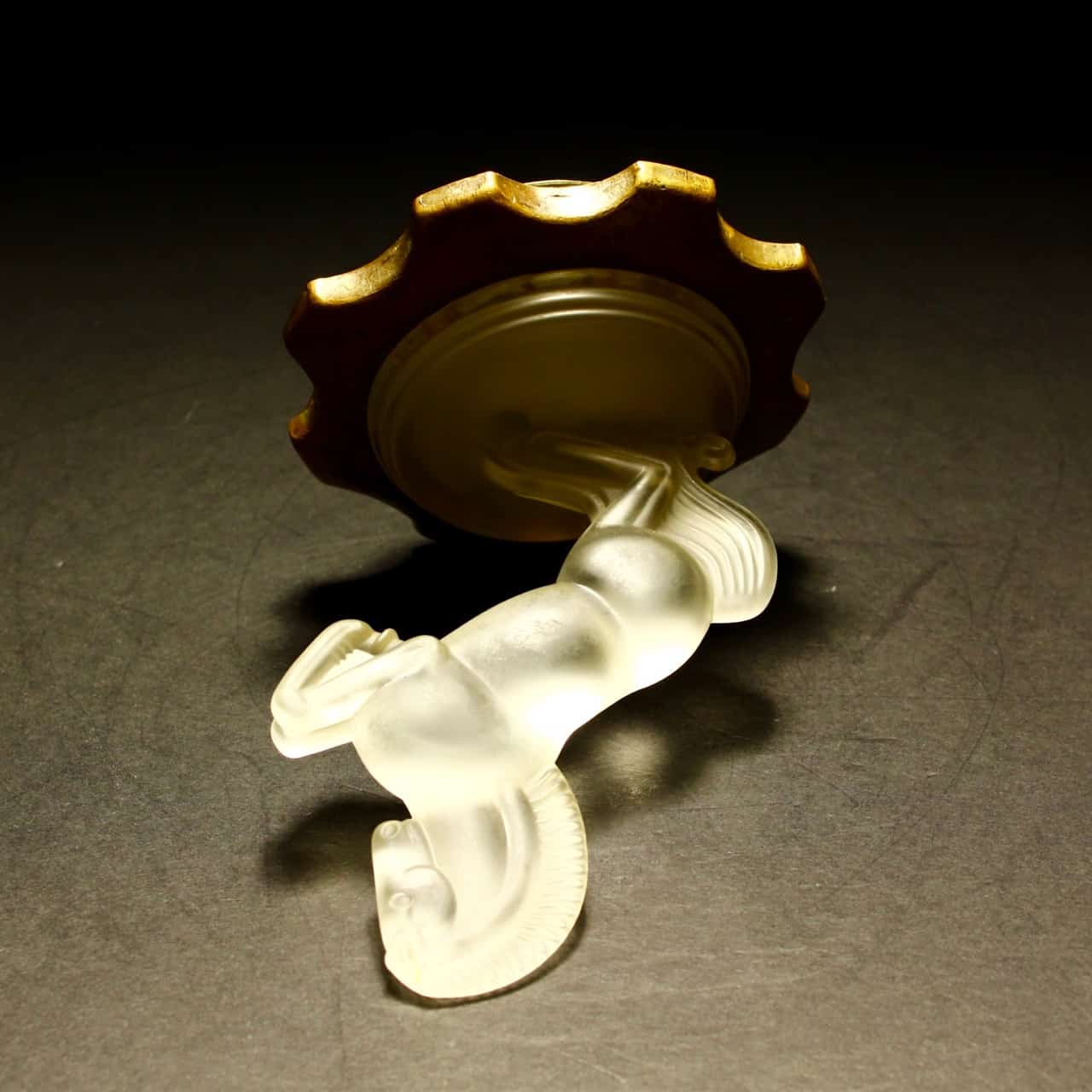 The Ferrari frosted glass car mascot comprises of a rearing horse set into a car radiator base and would date to the 1950s. The car mascot could have been designed by H.G Ascher and could have been retailed under Red Ashay. The base of the radiator cap is marked Patent. The car mascot is modelled on the Ferrari Horse and is quite unusual.