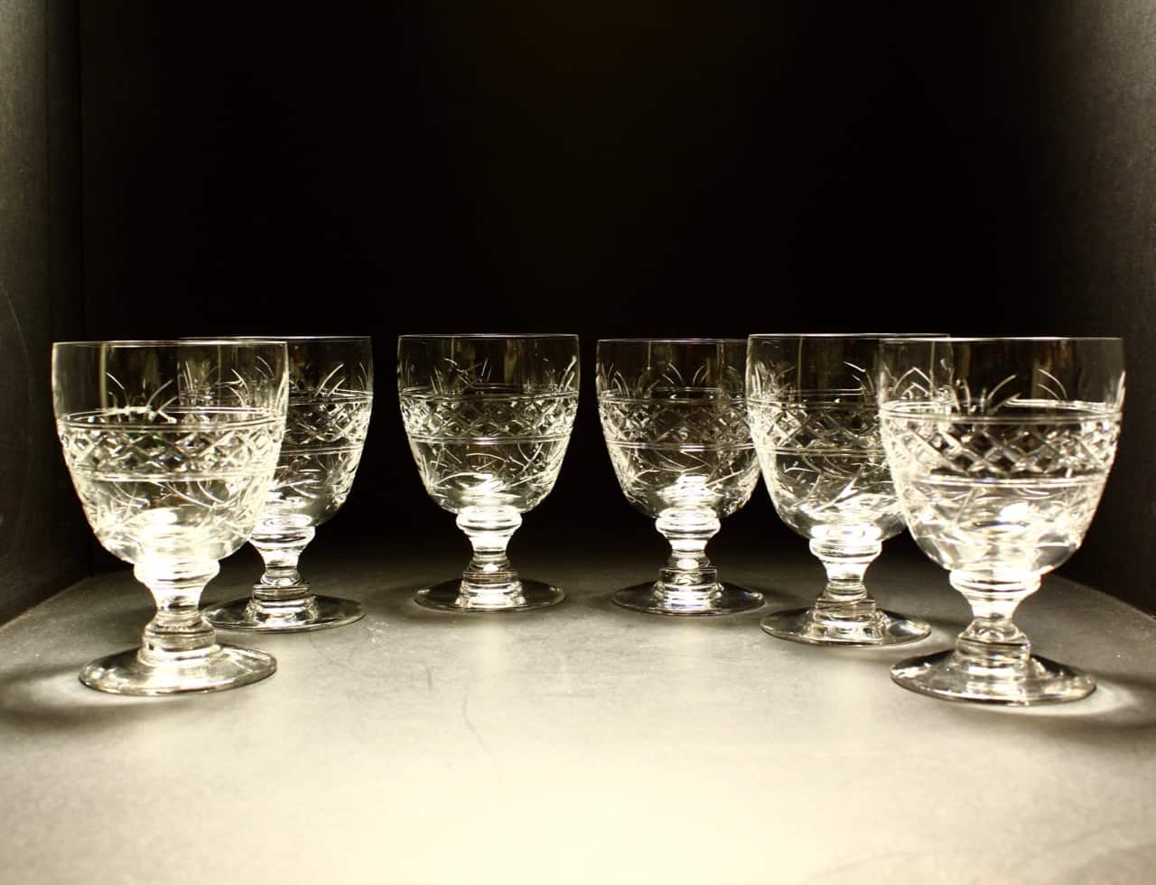 The Stuart wine glasses are fabulous quality with superb cutting and being a set of six matching wine glasses from the 1930s. What makes glasses so desiriably is they date to the 1930s, the large size of the glasses cut in the attractive design known as the goblet design number 26381 from the 1930s Stuart catalogue.