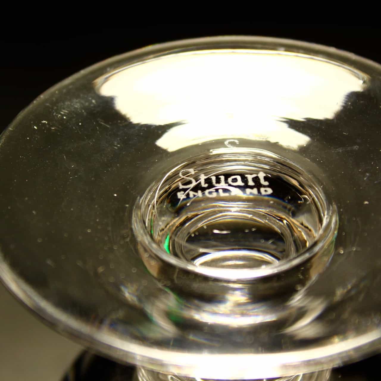 The Art Deco Stuart large red wine glasses date to the 1930s and are a fabulous design known as design number 26381. The wine glasses comprise of large round funnel cut bowls, falling down onto a compressed baluste stem, resting on a conical foot with acid etched signature STUART ENGLAND.