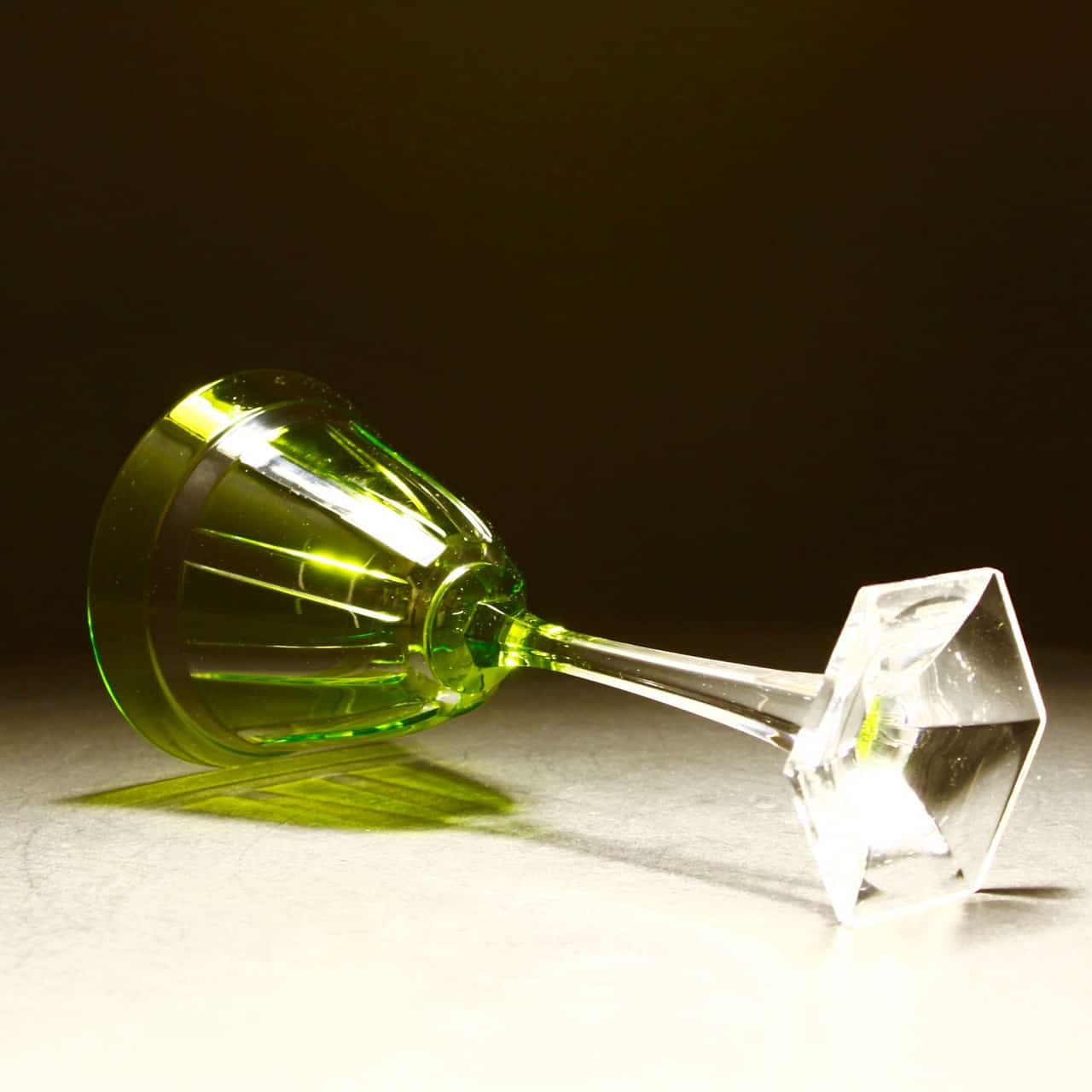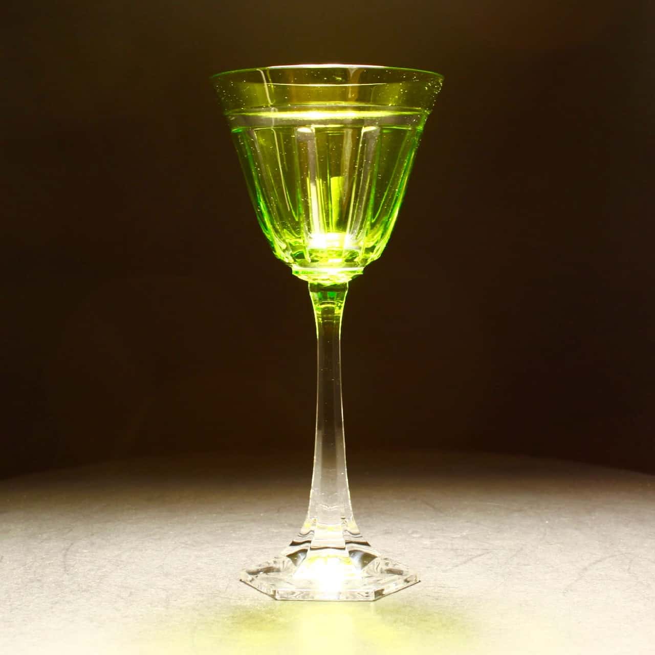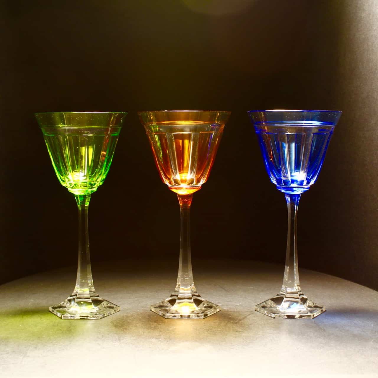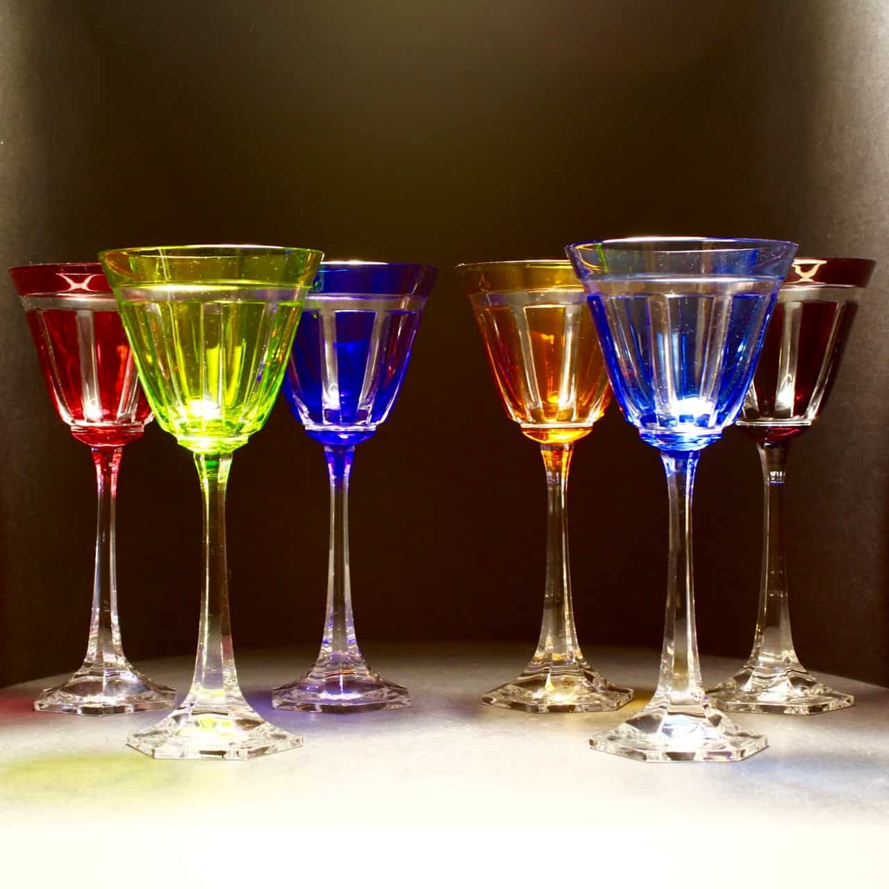 The Nachtmann hock wine glass set dates to the 1950s and have the most fabulous colours and geometric design. The wine glasses comprise of large round funnel cased bowls in six various colours, falling down onto a panel cut stem, resting on a hexagonal foot with the acid etched signature NACHTMANN.